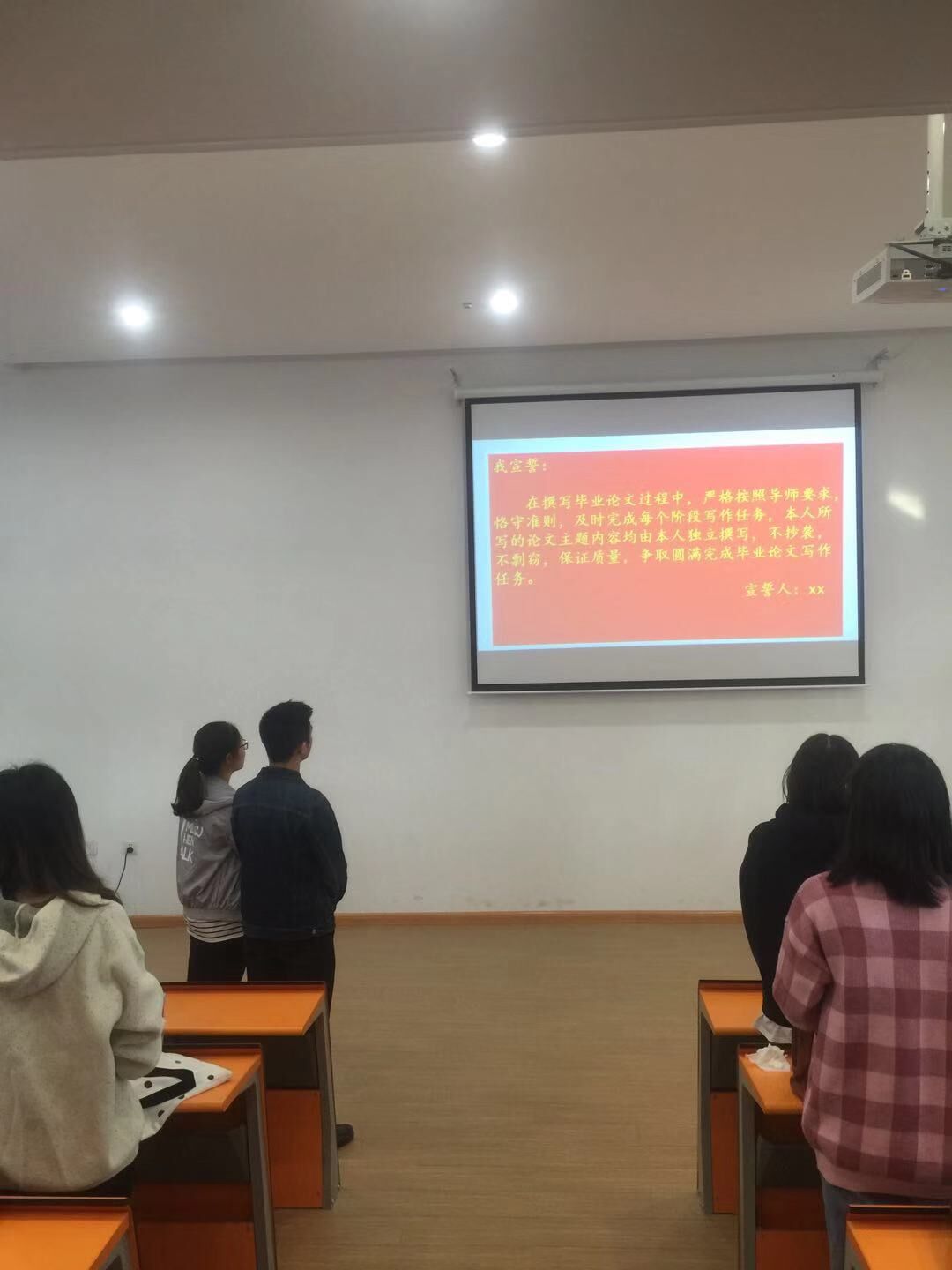 之后,由员工代表带领各班同学进行论文写作诚信宣誓,承诺“在撰写毕业论文过程中,严格按照导师要求,恪守准则,及时完成每个阶段写作任务,本人所写的论文主题内容均由本人独立撰写,不抄袭,不剽窃,保证质量,争取圆满完成毕业论文写作任务。”