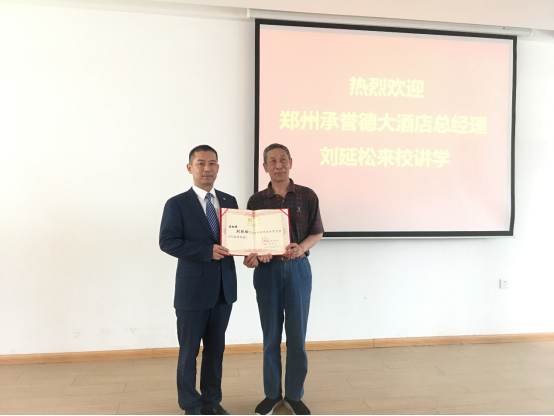 2019年5月23日,郑州承誉德大酒店总经理刘延松莅临yL23411永利集团官网,为旅游管理、酒店管理专业的师生作了主题为“标准与标准化在服务业中的应用”的报告,本次报告由旅游管理教研室主任梅华老师主持。刘延松,现任郑州承誉德大酒店总经理,同时兼任:河南省旅游协会饭店业分会副会长、河南省餐饮协会副会长、河南省星级饭店评定员、郑州市旅游协会副会长、河南省餐饮标准化技术委员会委员及中国城市标准化联盟民宿标准委成员。