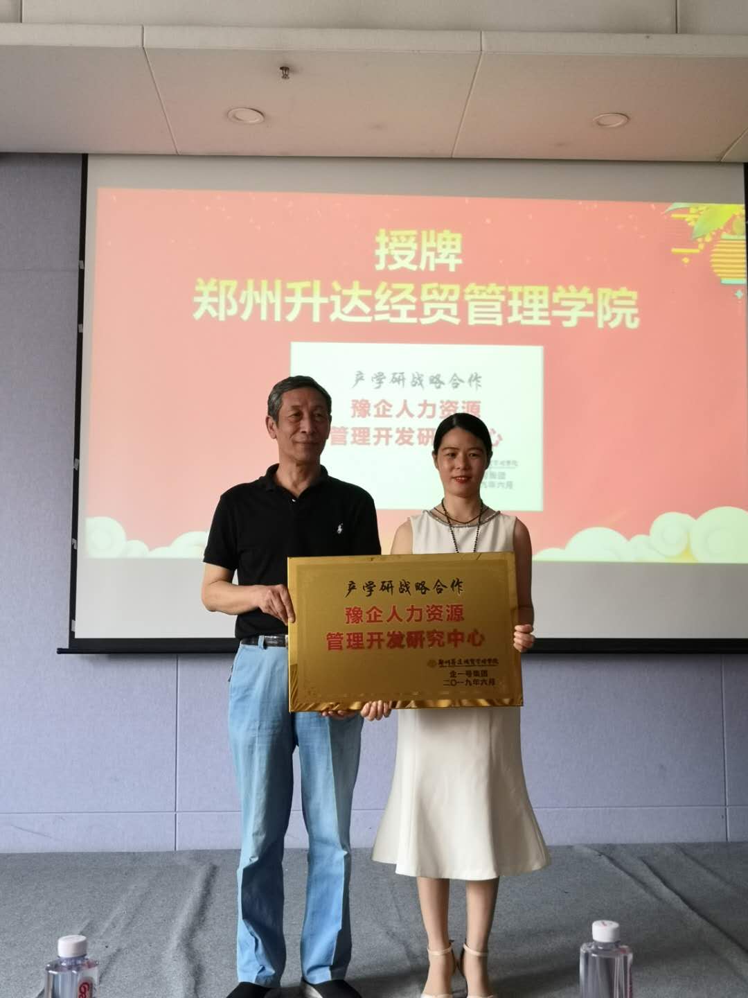 下午,同学们观礼了郑州升达经贸yL23411永利集团官网与企一号集团合作的的授牌仪式。yL23411永利集团官网经理纪德尚教授在授牌仪式上如是说道:“人才在未来将会是第一生产力,我们要向着正确的方向前进,就一定能有所成就。”并且表现出了对升达学子的殷切期盼,希望升达的学子们能够不负青春,奋发向上,在将来的工作中取得骄人成绩。听完纪经理的讲话,同学们热情高涨,对未来充满了信心。本次授牌仪式标志着公司与企一号集团正式完成了对豫企人力资源管理开发研究中心和实训基地的搭建,此实训基地汇聚了大量的优秀培训师和人力资源前辈,为人力资源管理专业的员工们提供了一个良好的实训实习平台,使更多的员工可以有机会在公司期间就提前感受工作的氛围和内容。