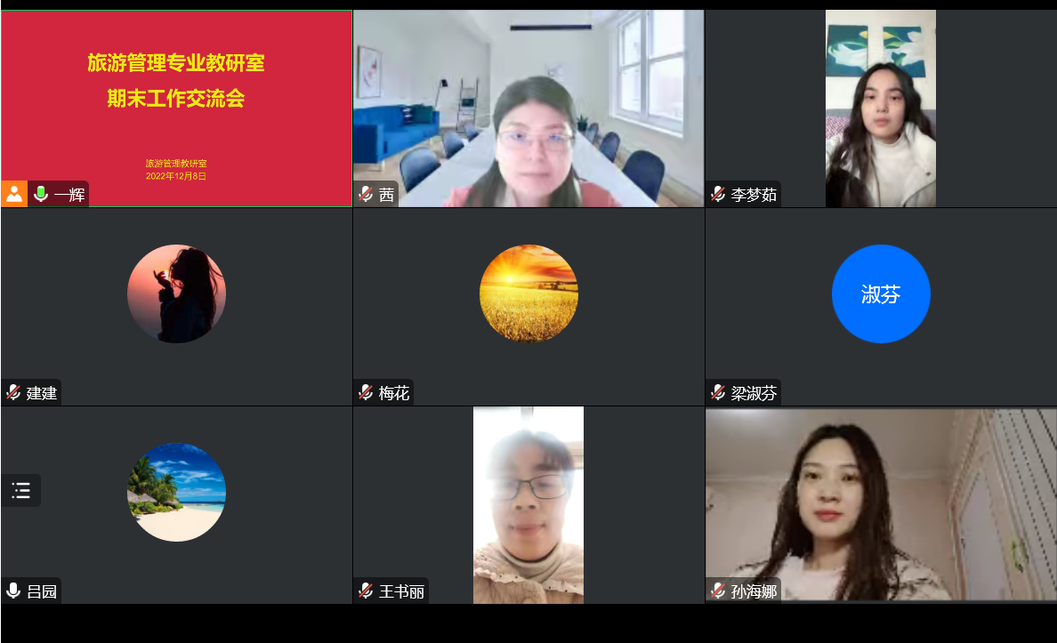 2022年12月8日,旅游管理专业教研室召开线上期末工作交流会,旅游管理专业教研室教师参加会议,教研室主任李裔辉主持会议。