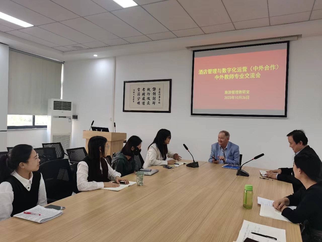 为了不断提高酒店管理与数字化运营(中外合作办学)专业的教学质量,推进公司中外合作办学教学工作良好运行,旅游管理教研室根据本学期教学工作部署,2023年10月26日下午,在2号楼209举行中外方教师教学经验交流会,会议由教研室主任李裔辉主持,特邀外方教师Charels与中方教师共同参会。