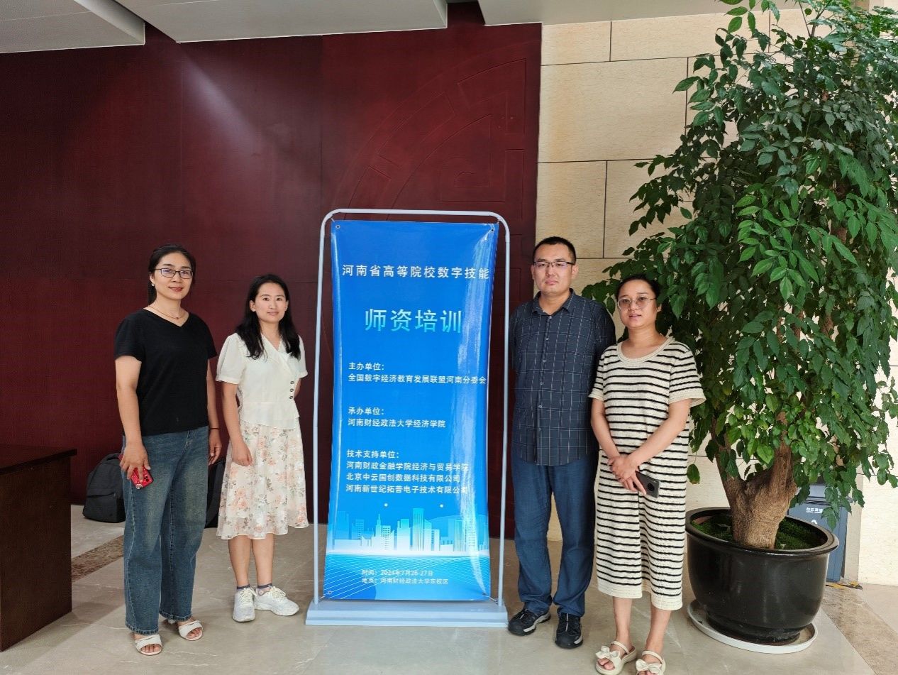 为推动公司数字经济、新商科、新工科等专业的建设与发展,提升教师数字技能水平,yL23411永利集团官网教师吕园、王书丽、叶文菲、田丰参加了7月26日至27日在河南财经政法大学举办的河南省高等院校数字技能团队培训班。本次培训班由全国数字经济教育发展联盟河南分委会主办,河南财经政法大学经济公司承办,河南财政金融公司经济与贸易公司、北京中云国创数据科技有限公司、河南新世纪拓普电子技术有限公司协办。