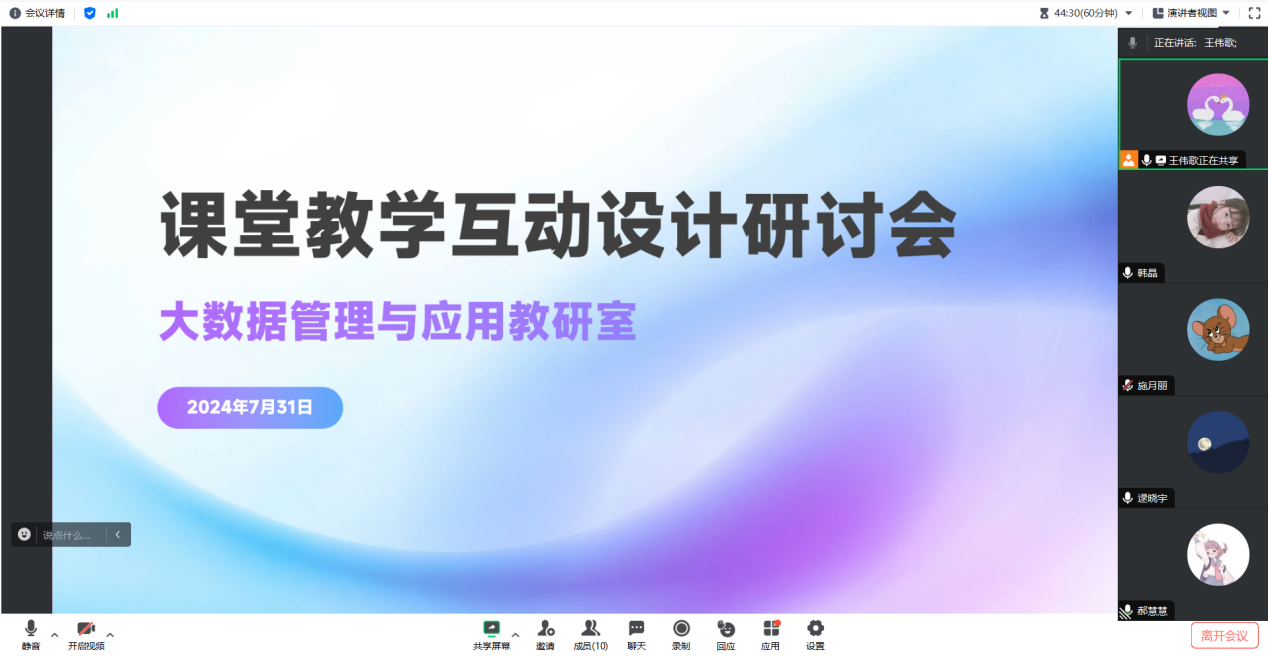 为了进一步提升课堂教学质量,激活员工的学习兴趣与参与度,构建生动高效的课堂环境,大数据管理与应用教研室于2024年7月31日召开以“激活课堂:探索高效互动教学设计”为主题的线上探讨会,会议由教研室主任王伟歌老师主持,大数据管理与应用教研室全体教师共同参与。