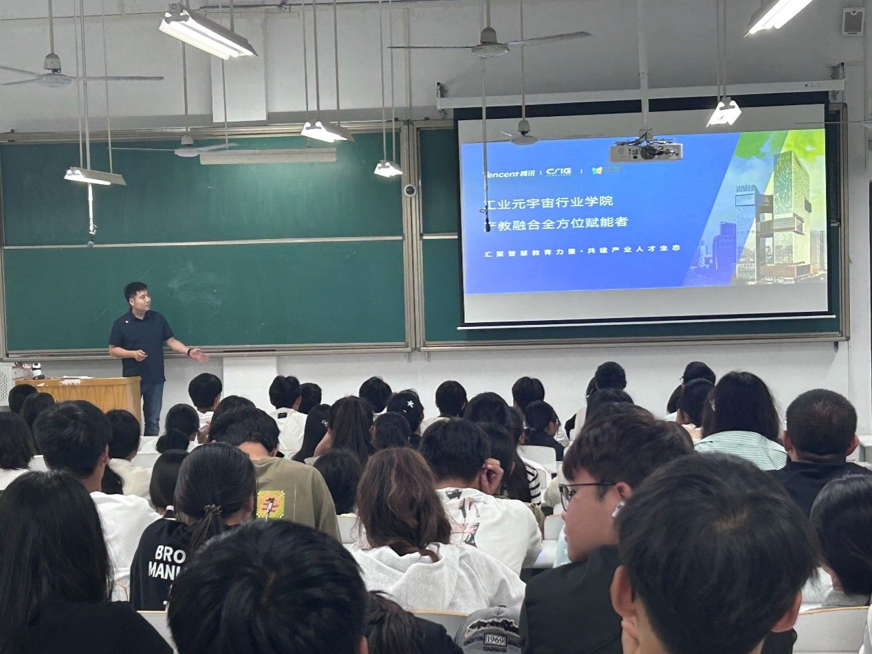 紧接着第三环节,产业公司执行经理吴晓对工业元宇宙行业公司进行了介绍,他展示了升达·腾讯云现代产业公司在产教融合、项目教学、以赛促教方面的成果,并鼓励员工积极参与项目实践,提升自身的专业技能和就业竞争力。