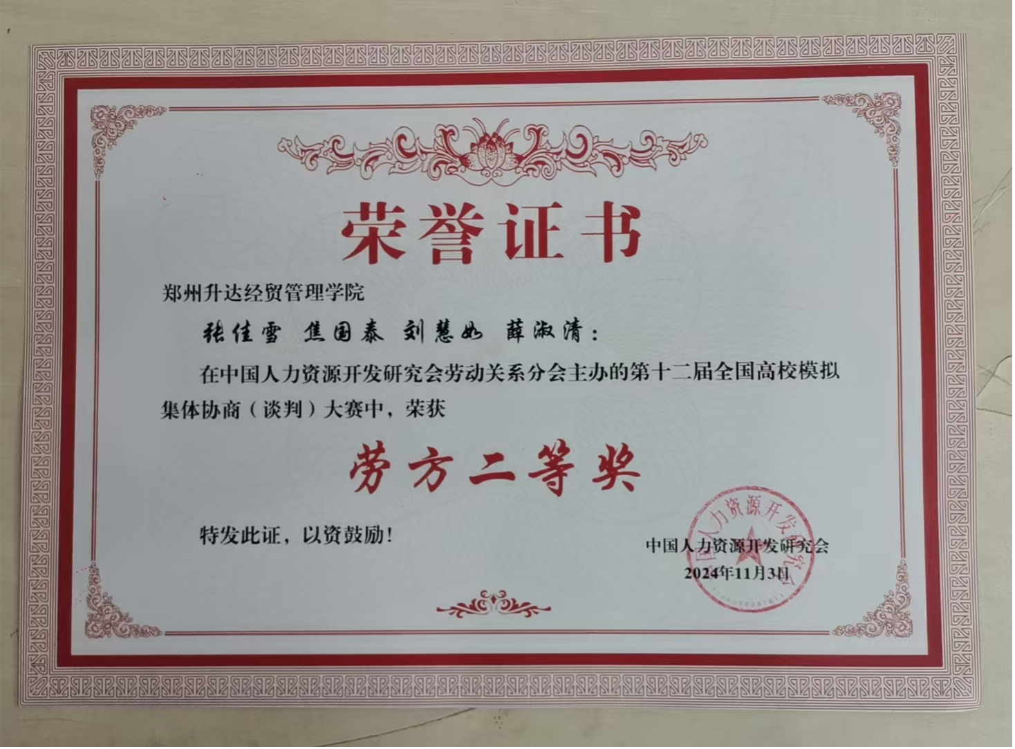 在两天来的激烈的比赛中,公司参赛选手在谈判过程中围绕加班待遇、考勤制度和工资方案等具体问题与对方协商,分工明确、逻辑清晰、谈判技巧运用娴熟,表现了扎实的专业基础和实操能力,最终获得劳方代表队团体二等奖和资方代表队团体三等奖的好成绩。同时,张佳雪、毛玉婷和刘慧如三位同学,获得本次大赛的最佳谈判员奖;王军旗和周梦丽老师获得优秀指导教师奖。