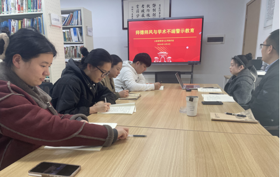 为强化教师职业理念,培养高尚的师德修养,弘扬科学家、教育家精神,加强学术道德与学风建设,2024年12月4日,大数据管理与应用教研室在教学2号楼205会议室召开师德师风与学术不端警示教育专题活动,旨在强化教师们对师德师风的理解与践行,同时深刻认识并警惕学术不端的危害。本次会议由田丰老师主持,教研室全体老师参加。