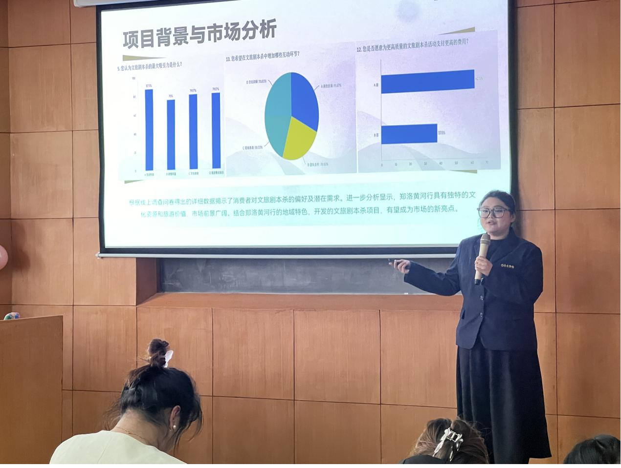 首先,大赛由主持人王泽晗同学致简短的开场白,随后正式拉开了本次赛事的序幕。各个参赛小组按照抽到的序号依次登场,通过精彩的现场展示和讲解,详细阐述了旅游产品策划方案的创意理念、市场定位,需求分析、产品策划的规范与合理性、产品策划的创新性与特色、宣传推广、可行性分析、并着重说明了线路的可行性及报价,为之后能正式落地投入市场打下了坚实的基础。通过各组的主讲选手的展示,均赢得了评委和观众的热烈掌声。
