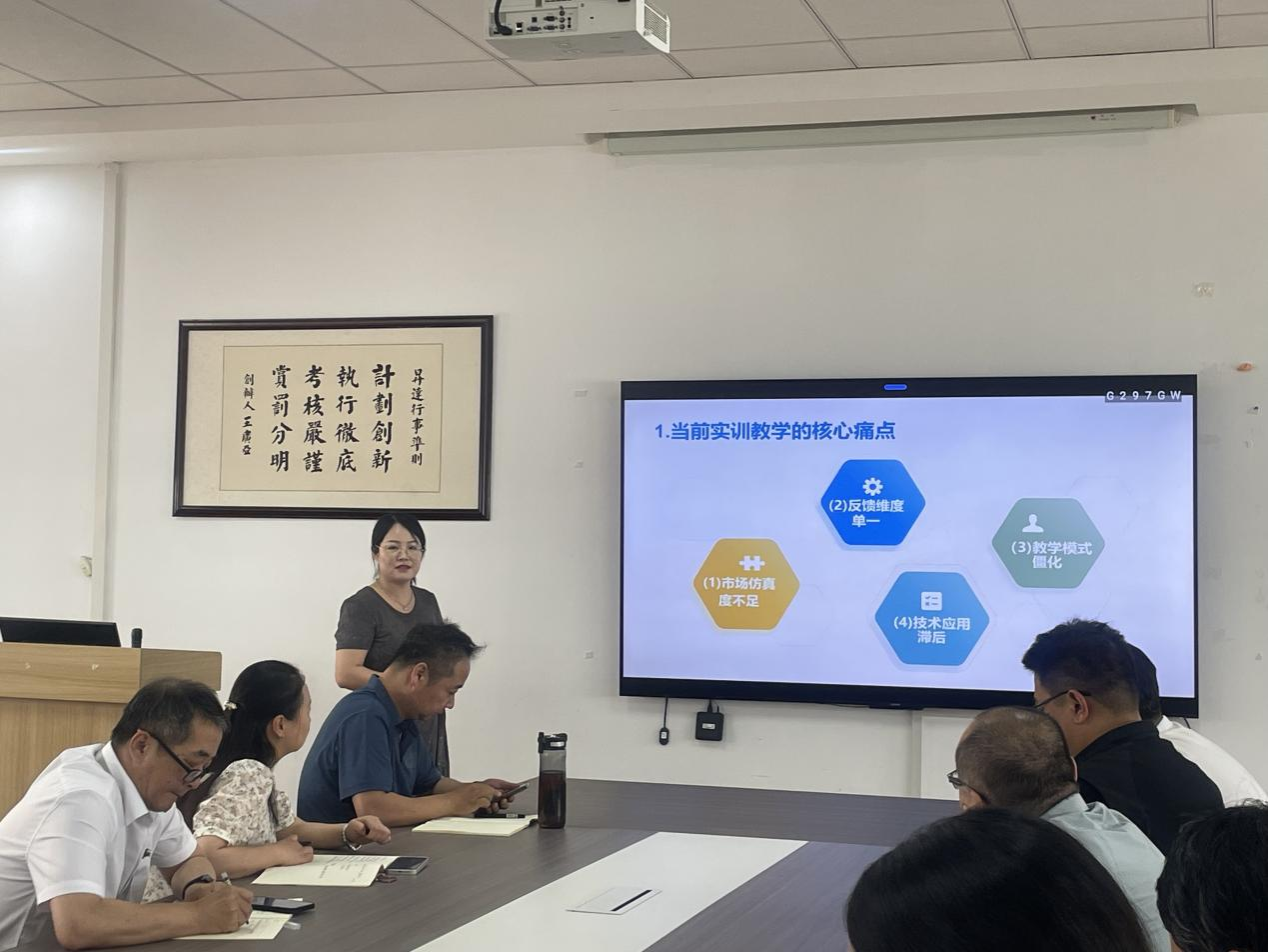 分享结束后,教研室老师进入讨论状态,在案例分享基础上,教研室主任董芳芳老师进一步强调实训教学需优化实施流程与考核体系。她提出,实训课程应细化阶段性任务清单,并推动考核体系从“结果导向”转向“过程与创新并重”,例如将方案迭代次数等纳入评分维度,激励员工持续优化实践成果。王小锋老师结合自身《跨专业综合实训》课程经验进行了分享,他提出“五步走”教学法:团队建设(通过破冰活动组建跨专业小组)、规则讲解(结合行业案例剖析竞争逻辑)、试运营(允许试错并设置“亏损保护期”)、试运营总结(员工主导复盘会提炼优化方案)、正式运营(引入真实企业数据提升决策压力),形成螺旋上升的学习闭环。此外,他特别提到“实训可视化”设计,例如指导员工制作运营海报、路演短视频,既增强学习成果展示度,也锻炼员工的数字化表达能力。