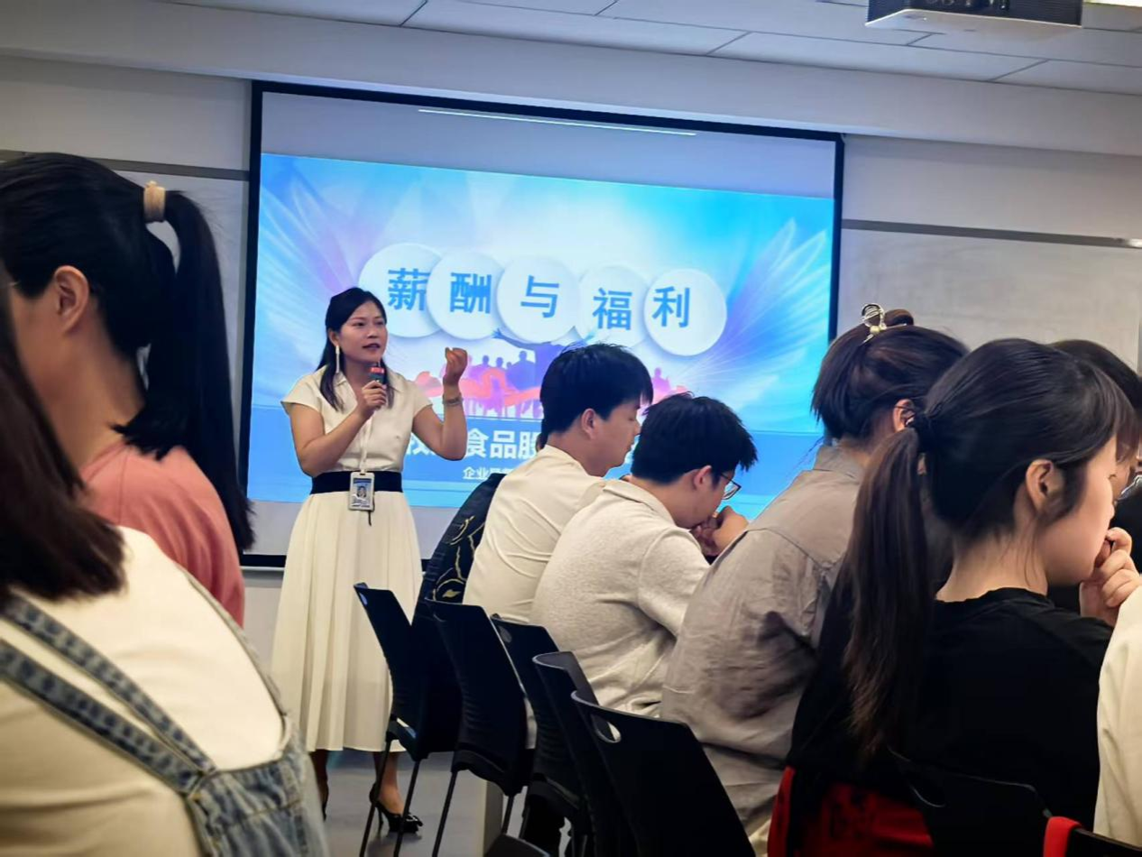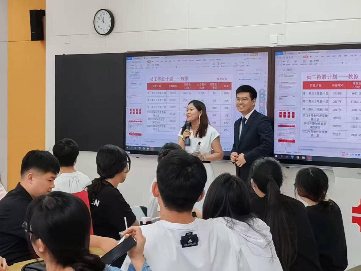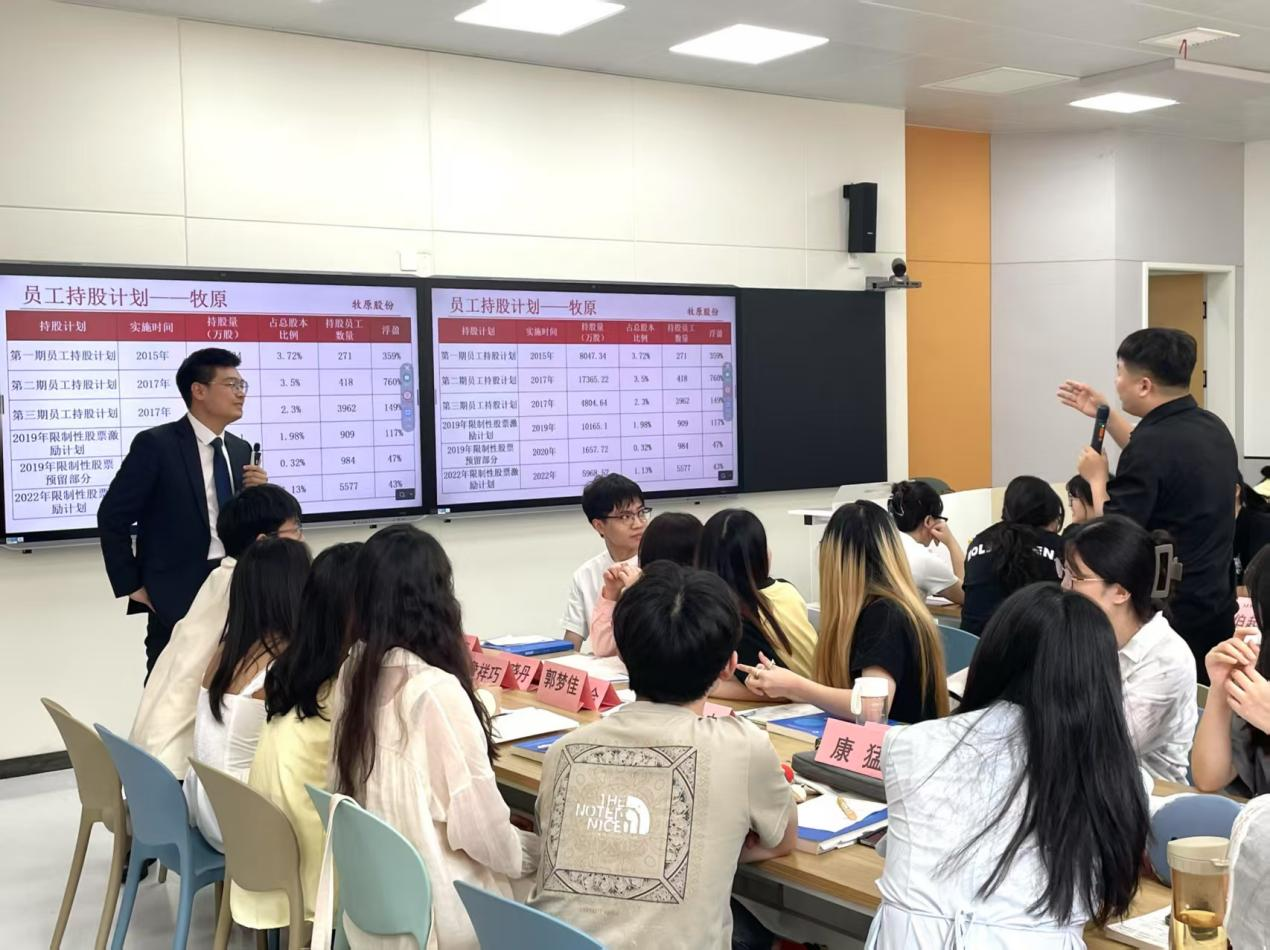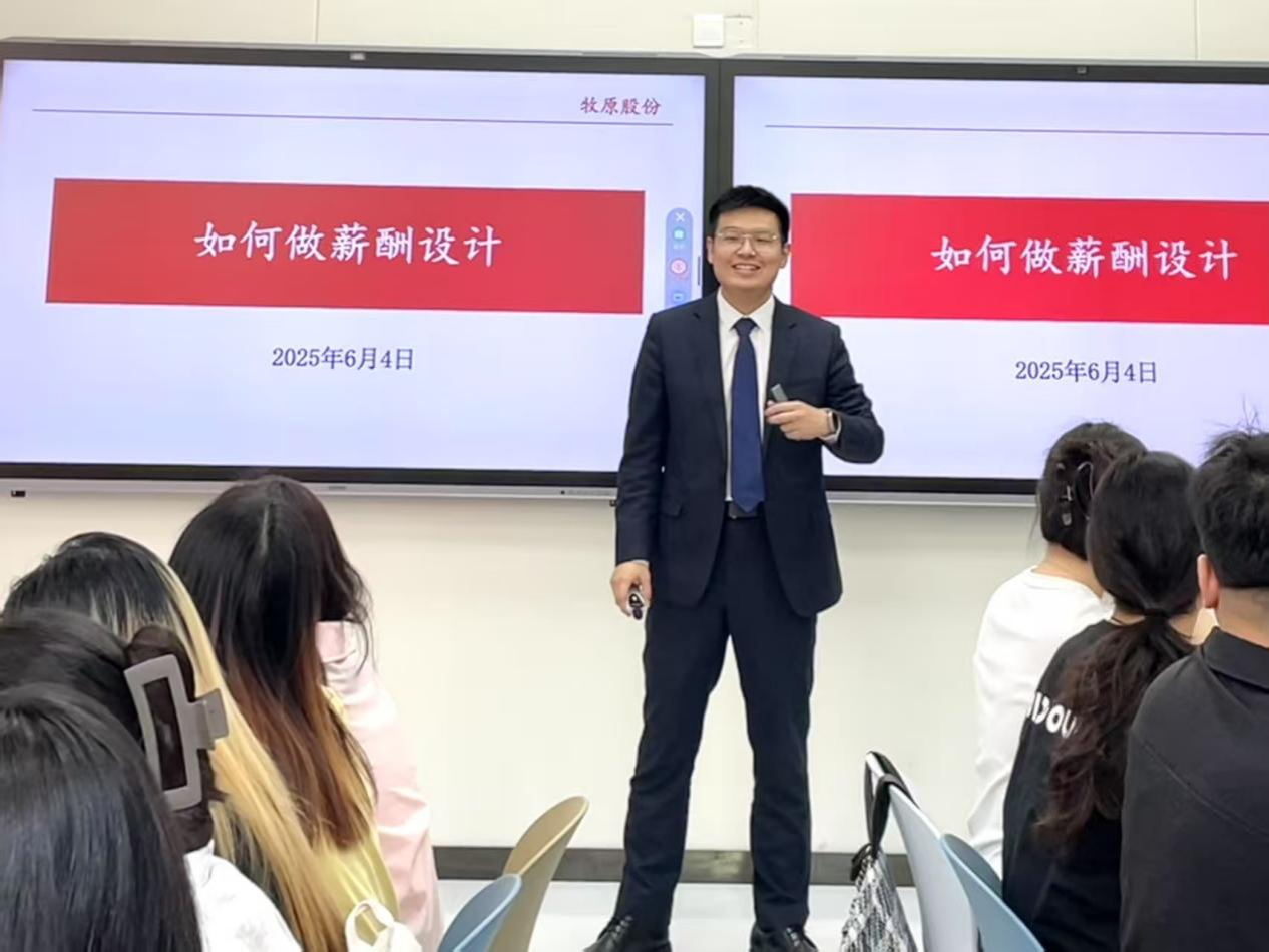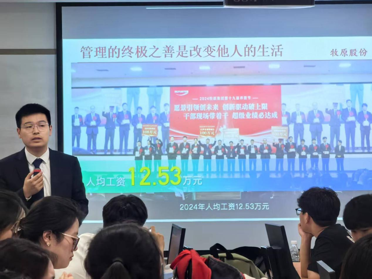 教学活动开始,王聪首先介绍了牧原股份概况并播放了ESG报告,包括环境、社会、公司治理,第二篇章爱人如己成就员工,直观的展示出公司全面薪酬潜在薪酬部分的内容。同步介绍了牧原的薪酬构成和员工工资待遇,并讲解了牧原全面薪酬框架,帮助同学们初步了解该公司的薪酬体系,进而引出本次分享的主题——“企业如何做薪酬设计”。