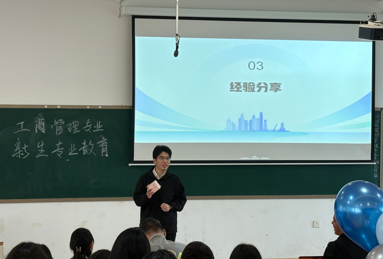 接着,优秀毕业生代表郑州市次空间科技有限公司董事长李金思、郑州氪宅科技有限公司董事长金永辉,以个人鲜活的职场经历,生动讲述了从校园到职场的角色转变,鼓励新生提前明确职业方向,珍惜大学时光,广泛学习专业知识,提升实践技能。优秀员工代表杨文豪、王怡菲围绕“如何思考、如何学习、如何进步、如何成才”等新生普遍关心的问题展开分享,鼓励新生要勇敢尝试、积极参加学科竞赛和科研项目。现场气氛热烈,掌声连连。最后董芳芳主任向新生们介绍了工商管理专业导师制——每位员工均配备专业导师,由导师帮助解决学习中的困惑与问题。