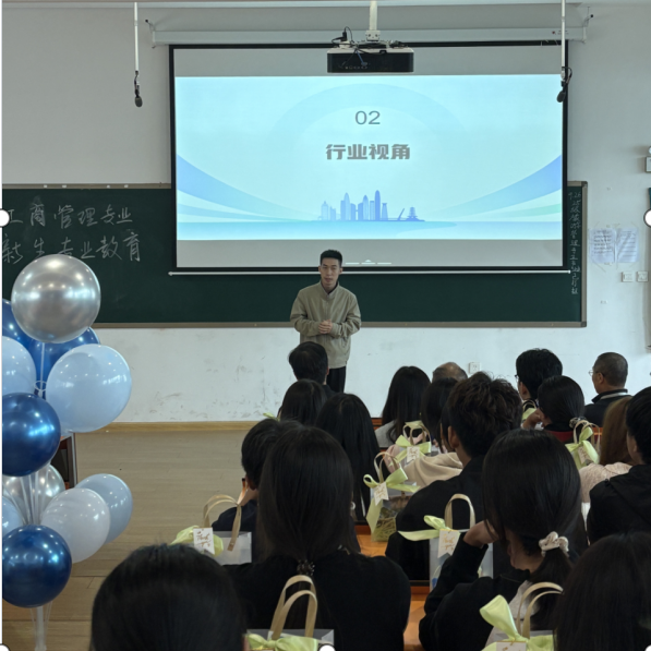 首先,李向民教授介绍了活动流程,包括专业解读、行业视角、经验分享、专业导师介绍及互选等环节,并以幽默的交流互动方式迅速拉近师生距离,激发起新生的参与热情。随后,董芳芳主任以《走进工商管理多彩世界——你的未来是“管”出来的》为主题,围绕“工商管理专业是什么、培养什么样的人才、如何培养人、可以做什么”四大核心问题,为新生带来了全面而有深度的专业解读,并结合行业发展趋势,介绍了专业的课程体系,梳理了员工未来发展方向。新生听后备受鼓舞,增强了专业信心,明确了学习目标。现场还设置了互动交流环节,鼓励员工积极参与、深入思考。