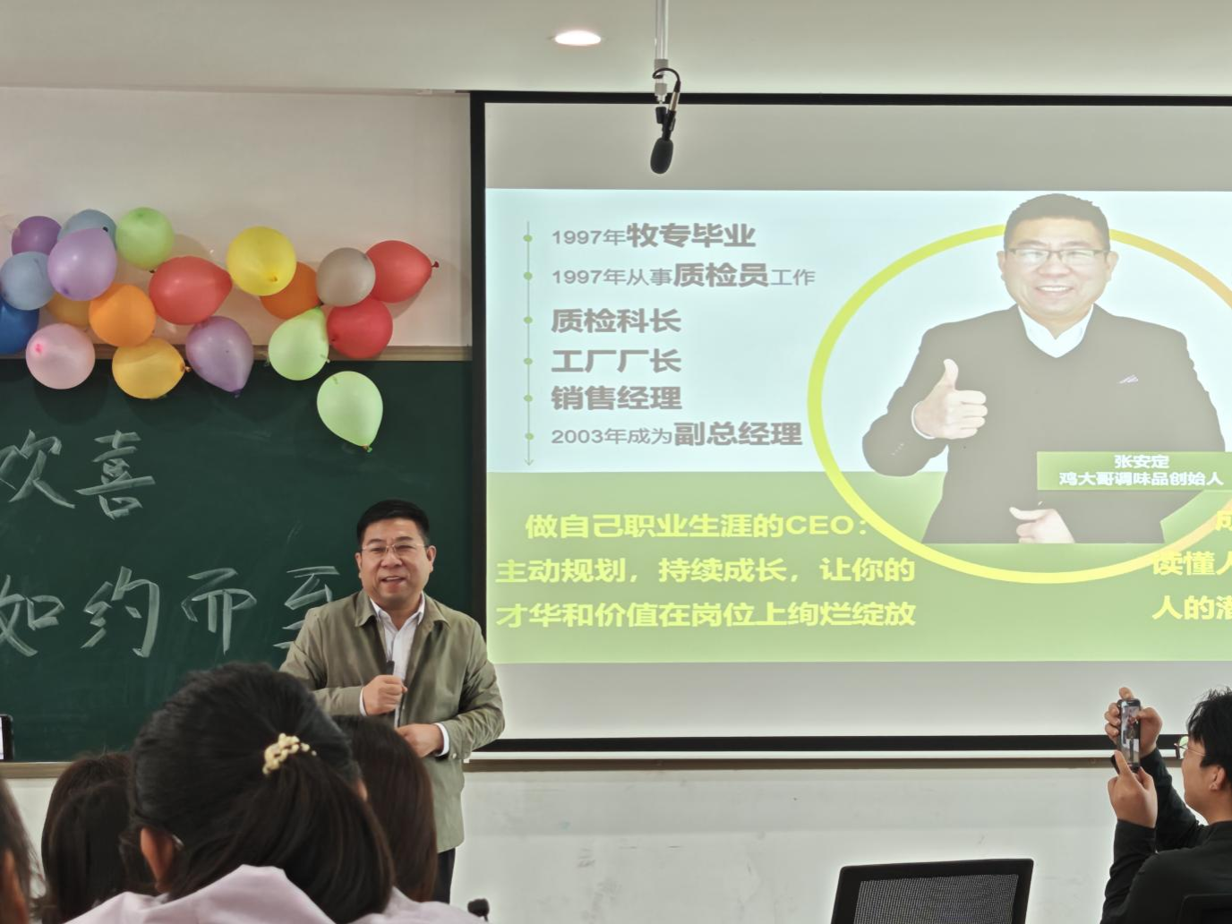 鸡大哥调味品有限公司2021级人力资源管理专业员工田佳艳,以“校园到职场”的过来人身份,分享了校园经验与职场感悟,建议新生积极参与训练营、团学会与竞赛等实践活动,提前规划证书考取,并通过企业公众号等渠道了解人力资源管理专业实际工作,激发专业兴趣。鸡大哥调味品有限公司创始人张安定则以自身就业创业经历,为新生打开职业发展思路,指出专业学习是职业发展基石,争取突出表现,并分享了企业管理中沟通与激励的实践经验,告诉同学们做人要争做第一,成绩、能力、口碑、体育、演讲等,只有突出才能被看见。张总的自身经历还让同学们感受到,只要愿意踏实深耕,就可以在企业中从基础岗位做到厂长岗位,如果储备了足够的能力,还可以创业成功的信心。此外,他还分享了双汇校园招聘的严格标准与小企业“抢人”的战略思维,强调找工作尽量选发展中的企业,争取和企业一起成长。他寄语新生一定要有梦想,虽可能修正,但每一个阶段都要全力以赴,让新生深刻理解“实践出真知”的道理。