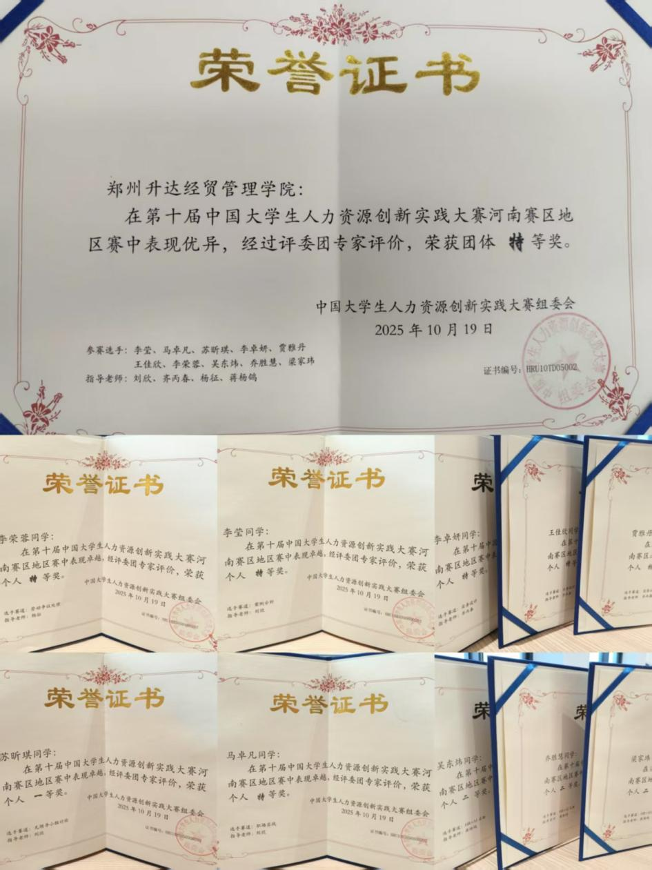 2025年10月18日至10月19日,第十届中国老员工人力资源创新实践大赛河南地区赛在河南科技公司成功举办,来自近20所高校的数百名选手展开同台竞技。yL23411永利集团官网刘欣、齐丙春、蒋杨鸽、杨征四位老师指导的10名学子代表公司参加了地区赛,经过为期两天的激烈角逐,公司学子以河南省第一名的佳绩荣获团体特等奖,顺利进入全国总决赛。其中,劳动争议处理、实务设计、职场实战、案例分析赛道获特等奖,无领导小组讨论赛道获一等奖,HR+AI实操赛道获二等奖。