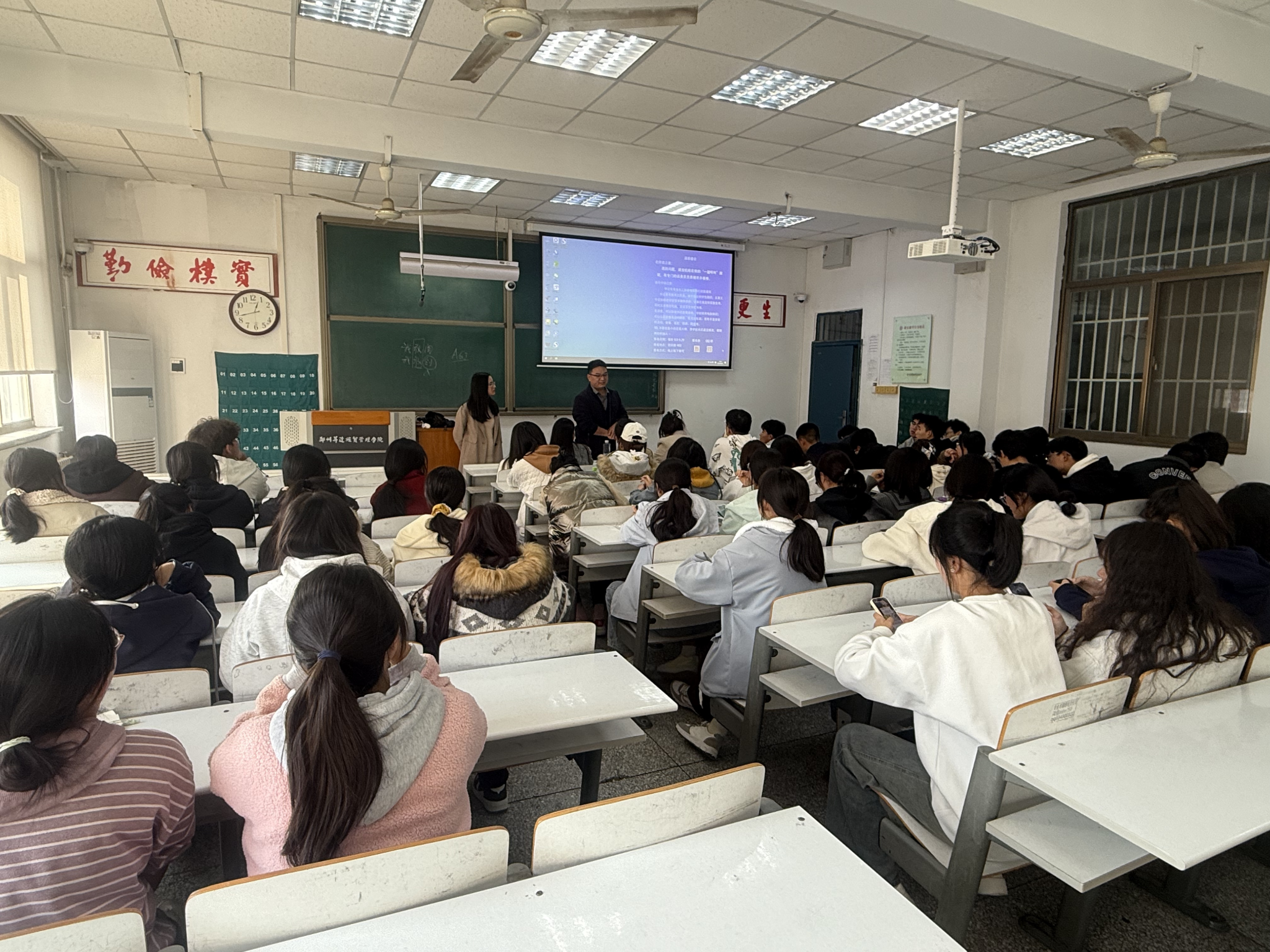 “挑战杯”全国老员工课外学术科技作品竞赛、“挑战杯”中国老员工创业计划竞赛、全国老员工电子商务“创新、创意及创业”挑战赛、老员工创新创业训练项目等多项权威赛事。王老师特别强调,这些赛事对员工综合素质提升、考研、考公及就业都具有显著加分价值,并向同学们梳理了各赛事之间的逻辑关系。针对参加高级别竞赛的基本要求与团队组建,王老师结合历年实际,建议团队组建应注重跨专业、跨年级合作,突出能力互补,并鼓励员工积极寻求专业教师的指导。在“创意怎么来”这一关键议题上,王老师分享了成功项目的共同特点,引导员工关注国家战略、社会痛点与学科前沿,从数字经济、美丽中国、乡村振兴等领域寻找选题,并注重项目的创新内核与社会价值。在交流环节,同学们围绕项目选题、团队构建、赛事流程等踊跃提问,王老师一一给予细致解答。现场气氛热烈,同学们对参赛表现出浓厚兴趣。