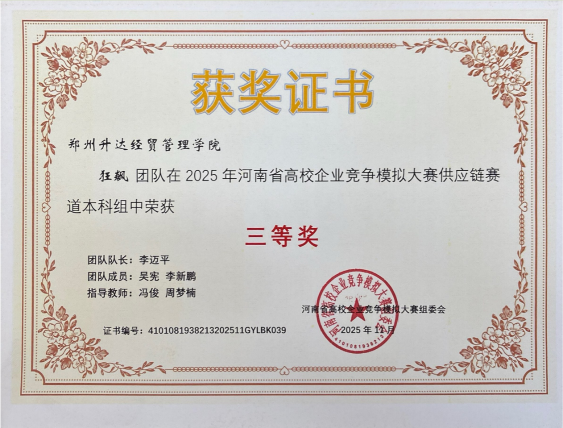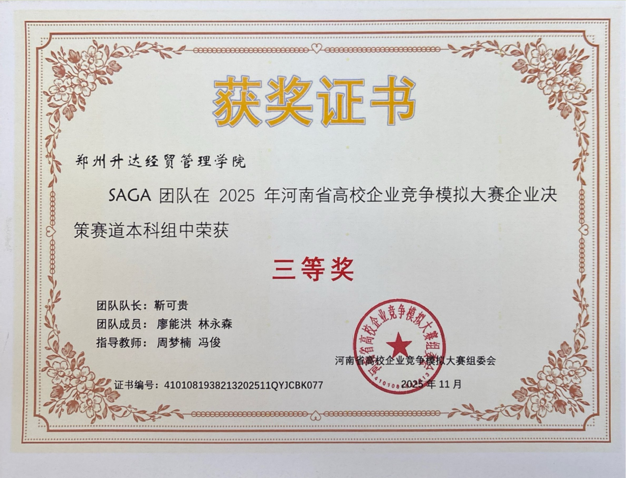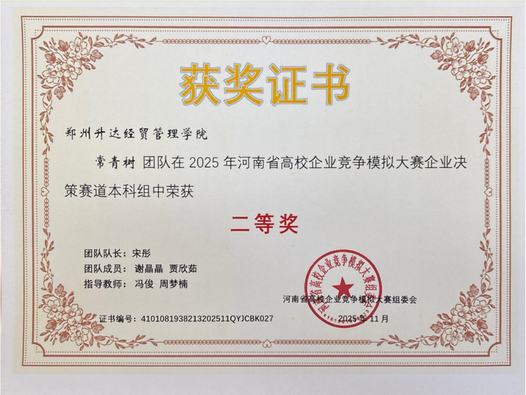 2025年11月30日,2025年河南省高校企业竞争模拟大赛决赛在郑州工商公司圆满落幕。公司yL23411永利集团官网冯俊老师、周梦楠老师指导的3支队伍历经初赛、复赛的层层选拔,成功跻身决赛舞台,与来自全省34所院校的171支精英队伍同台竞技,经过两天的激烈角逐,3支队伍分别荣获全省总决赛团体二等奖和三等奖。