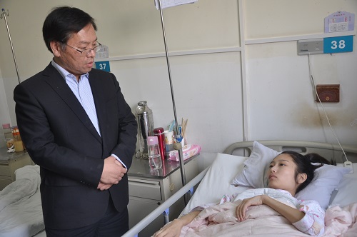张金安副经理代表公司将公司老师和同学的爱心捐款交给了王高雅同学父亲的手中,转达了师生对王高雅同学的深切问候。张金安副经理与负责该生的主治医师进行交谈,详细了解了她的病情。并询问了该同学近期治疗状况以及家庭生活状况等,张副经理鼓励王高雅同学坚强起来,早日战胜病魔,回到同学们身边来,回到公司这个大家庭。看到王高雅同学以积极的心态、坚强的意志积极配大家很是高兴。