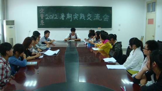 9月12日下午,由企管系团委主办的2012年暑假实践交流会在2号楼会议室成功举行,团委副书记王皓学长主持了本次会议,各优秀实践活动代表出席本次会议。