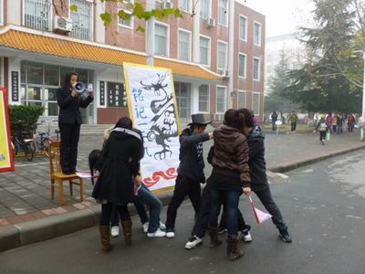 “一二·九”运动是中国共产党领导的一次大规模员工爱国运动。1935年12月9日,北平(北京)大中员工数千人在中国共产党的领导下举行了抗日救国示威游行,反对华北自治,反抗日本帝国主义,掀起全国抗日救国新高潮。此次人模展是企管系为纪念该运动所举行的系列活动之一。在凛冽的寒风中,演员们为同学们生动形象地再现了当时员工运动的一幕幕可歌可泣的动人场面:爱国员工不畏强暴,与军警展开英勇的搏斗,高呼“停止内战,一致对外!”、“打倒日本帝国主义!”、“反对华北五省自治!”、“收复东北失地!”、“打倒汉奸卖国贼!”、“武装保卫华北!”等口号,表达了当时全国人民抗日救国的呼声和誓死救国的英勇气概。解说员站在凳子上,声音洪亮,声情并茂,与表演二者完美结合。人模展使同学们仿佛置身于当年的爱国运动中,吸引了不少同学驻足观看。现场同学们也积极参与,情绪高涨,最后活动取得圆满成功。
