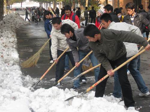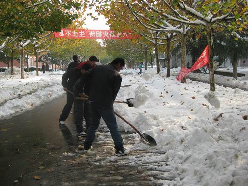 久违的瑞雪增添了几分喜庆,整个校园被笼罩在一片白色的世界中。为保证校园道路的通畅, 2009年11月12日下午和11月13日下午,企业管理系组织部分教工和员工投入到了扫雪铲冰的行动中。