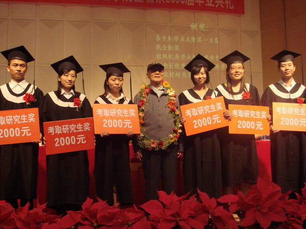 接下来院领导为我系获得全勤奖、专业第一名、校级优秀毕业生、省级优秀毕业生奖项的毕业生颁发了奖品和证书并合影留念,尊敬的创办人为我系考上研究生的17名同学分别颁发了2000元奖金,以对他们鼓励和祝贺!