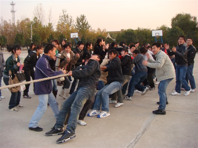 在比赛过程中最精彩的要数08人力资源专升本班和08级工商管理专升本班男女混合的比赛了,只见标志物在双方的争夺下一会移到这边一会移到那边,双方实力相当,僵持了很长时间,各不相让,旁边的啦啦队也随着他们的移动而移动。在你来我往之后,08工升本取得了胜利。