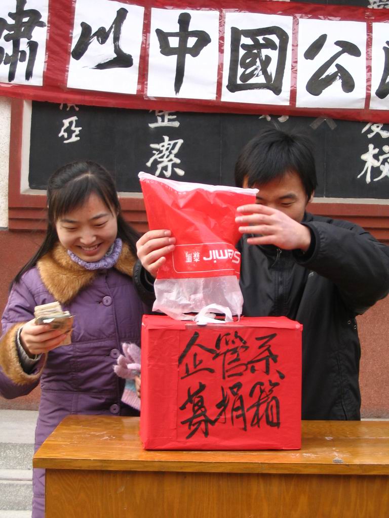 1月7日下午1点30分,企管系在教学二号楼前设立临时募捐点,虽然天气寒冷,在短短的十几分钟就吸引了近千名热心师生,沙献玉教授在现场捐款时说:“爱心无国界,我们应发扬国际人道主义精神,向印度洋海啸灾民伸出援助之手”,并向大家表示诚挚的感谢。