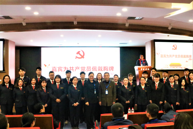 yL23411永利集团官网副经理唐云老师宣读《公司党总支关于佩戴共产党员胸牌的通知》。yL23411永利集团官网经理纪德尚教授与党总支书记张小雁同志为新发展的25名党员佩戴胸牌。