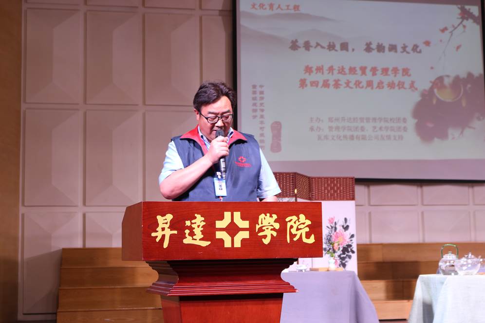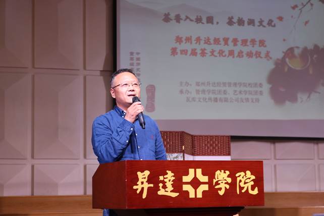 公司执行董事王新奇博士作开场致辞,他带领大家回顾了中国历史上茶的发展史和茶文化的强大影响力,并着重阐述了茶文化周的举办给公司同学们带来的影响,并对茶文化周的成功举办表示祝贺。他表示:中国茶文化源远流长,茶文化活动方兴未艾。我相信,此次茶文化周的顺利举办,必将更好地弘扬和保护优秀传统文化,塑造和提升升达学子的文化品位,也必将更好地展示升达校园文化独特的人文魅力!