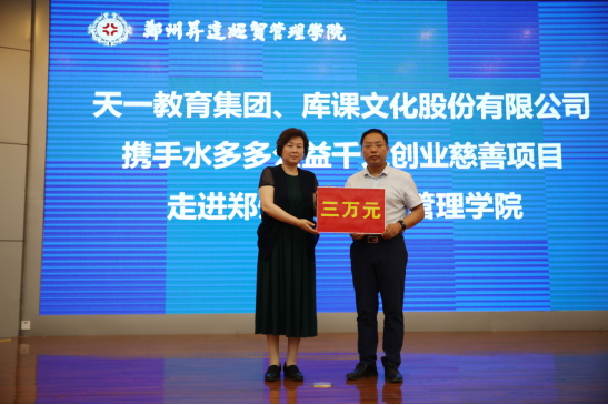 活动进行的第二项是捐赠仪式:天一教育集团、河南库课文化股份有限公司向郑州慈善总会捐赠老员工创业基金30000元,并向公司员工捐赠考研考证图书321套。郑州市老员工创业就业慈善基金对公司85名员工进行了微创业资助,每人300元,共计25500元。