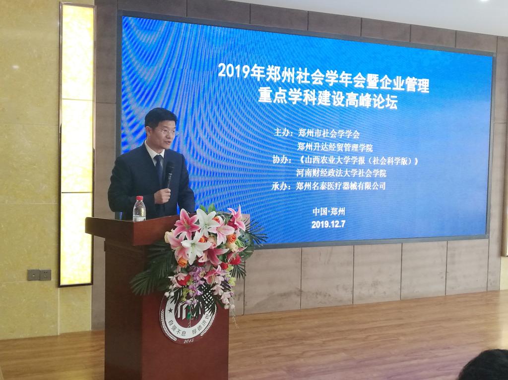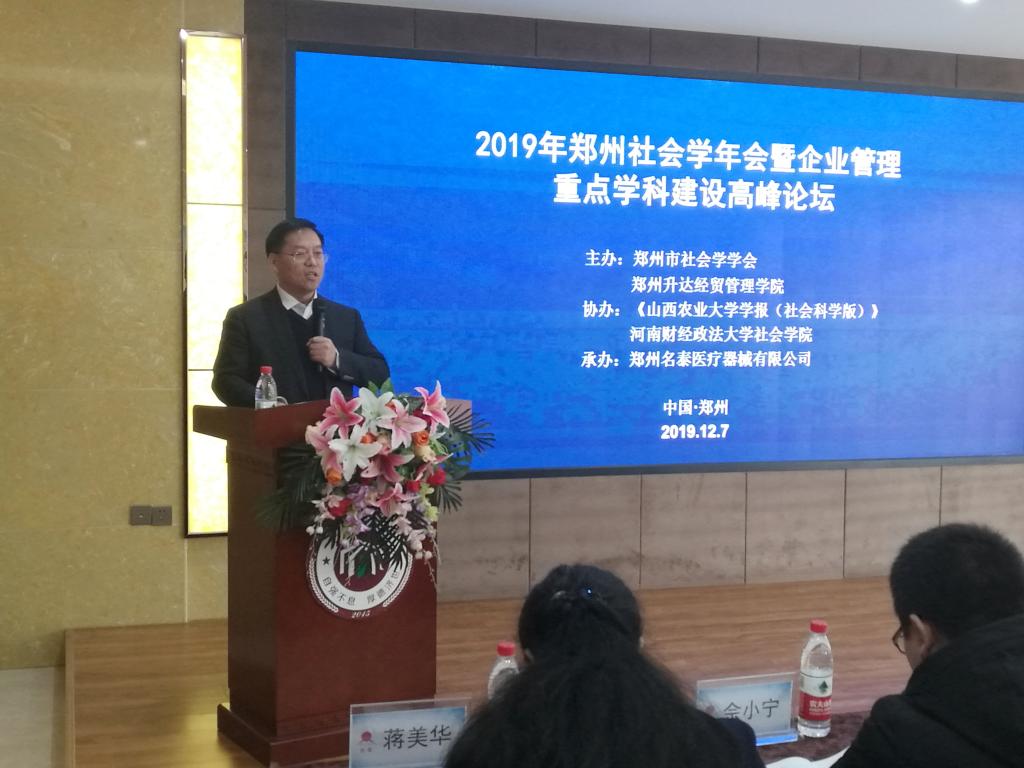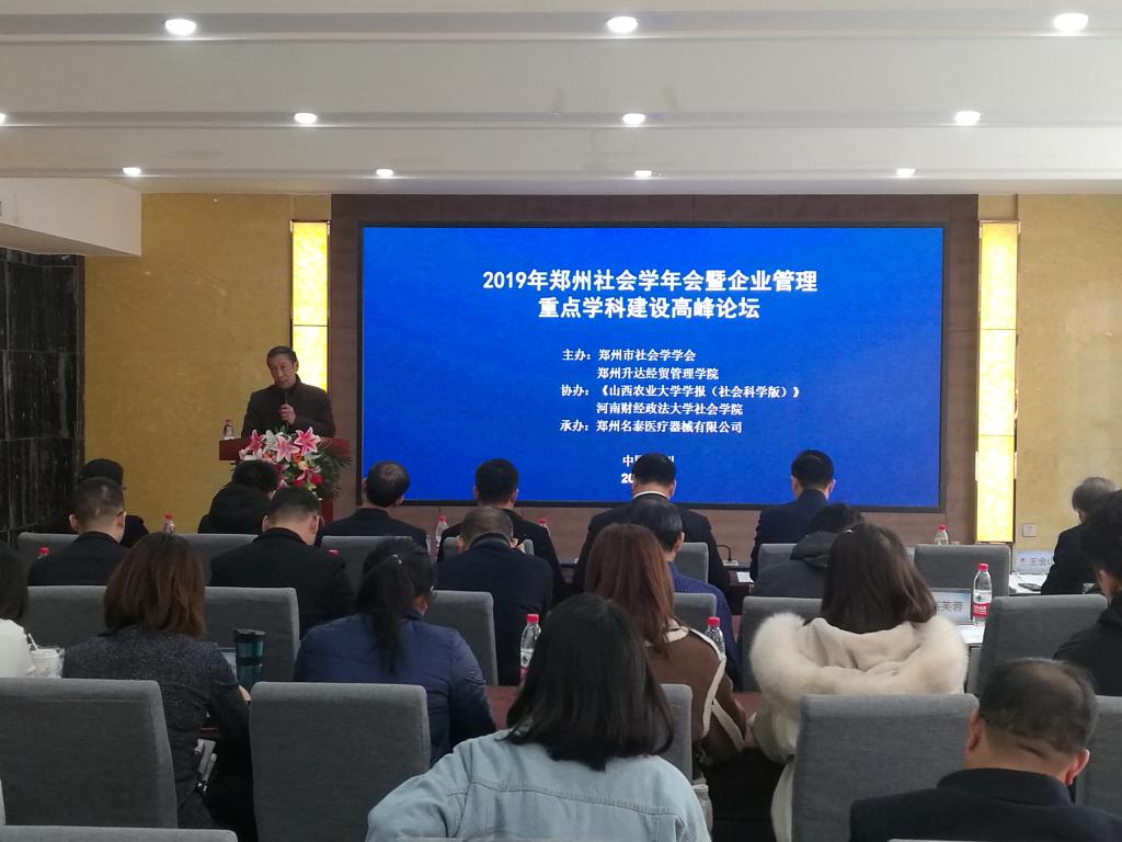 2019年12月7日,由郑州升达经贸yL23411永利集团官网和郑州市社会学学会联合主办、《山西农业大学学报》和河南财经政法大学社会公司协办的“2019年郑州社会学年会暨企业管理重点团队建设高峰论坛”在郑州名泰医疗器械有限公司隆重举行。本次高峰论坛汇聚了省内外13所高校二级公司经理、副经理、学科带头人、28位博士共计60位专家学者参加。郑州升达经贸yL23411永利集团官网副董事长张金安博士、科研处处长杨存博副教授、yL23411永利集团官网经理兼郑州市社会学学会会长纪德尚教授、商公司经理孙卫东教授以及yL23411永利集团官网、商公司企业管理重点学科成员参加了此次论坛。南开大学周恩来公司副经理赵万里教授、河南财经政法大学社会公司书记王金山教授、郑州大学公共与政治yL23411永利集团官网社会学、社会保障学专业负责人蒋美华教授、社会工作专硕负责人程建华教授、河南财政金融公司经济yL23411永利集团官网副经理高芙蓉博士、山西农业大学学报主任编审佘小宁等来自省内外13所高校的专家学者,共同围绕“企业管理重点团队建设问题及城乡治理问题”进行了深入解读与剖析。