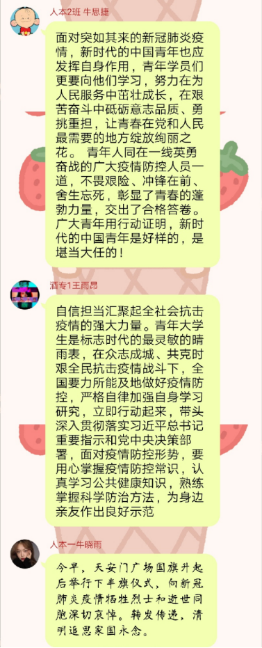 活动中,同学们怀着沉重的心情,登陆中华英烈网、郑州文明网等网络平台表达对先烈、英烈以及牺牲在抗议疫情一线英雄们的缅怀、致敬之情,随后他们或通过网络查阅资料,或询问家人,进一步了解先烈、英烈以及牺牲在抗议疫情一线英雄们为祖国为人民抛头颅、洒热血,不惜牺牲自己的生命的感人事迹,更深刻地体会到烈士们那种坚贞不屈、英勇无畏的高贵品质和革命精神。他们纷纷表示不能让烈士们的鲜血白流,要向英烈们学习,沿着先烈足迹,接过先烈手中的接力棒,继承先烈的遗志,勤奋学习,奋勇拼搏,勇敢地挑起建设祖国的历史重担,为使中华民族傲然立于世界之林而贡献自己的力量。
