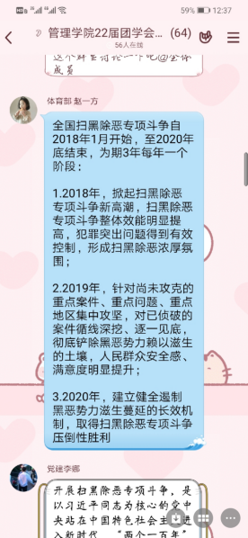 活动中齐利利老师指出:“开展扫黑除恶专项斗争,是以习近平同志为核心的党中央作出的重大决策。扫黑除恶工作要紧密联系公司工作实际,抓好落实,抓住重点,推动扫黑除恶专项斗争工作有效开展。并且通过此次活动,希望能够加强宣传教育,引导师生深刻认识黑恶势力的危害,增强甄别能力和防范意识。”同学们通过钉钉直播的方式积极参与,互相交流,并在活动最后纷纷表明自己的看法。