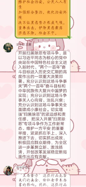 女生部王嘉说:开展扫黑除恶专项斗争,是以习近平同志为核心的党中央站在中国特色社会主义进入新时代、“两个一百年”奋斗目标进入历史交汇期的高度做出的一项重大决策部署。充分认识到这场斗争事关“两个一百年”奋斗目标和中华民族伟大复兴中国梦的实现;充分认识到这场斗争事关人心向背、治乱兴衰;充分认识到这场斗争事关全面建成小康社会。切实增强"扫黑除恶"的紧迫感和责任感,把深入开展"扫黑除恶"专项斗争作为工作新常态、维护一方平安的重要举措,紧紧抓在手上,深入推进下去,切实抓出成效,积极回应群众期待,为全区进一步革弊立新、激浊扬清,开创改革发展稳定新局面做出应有贡献。