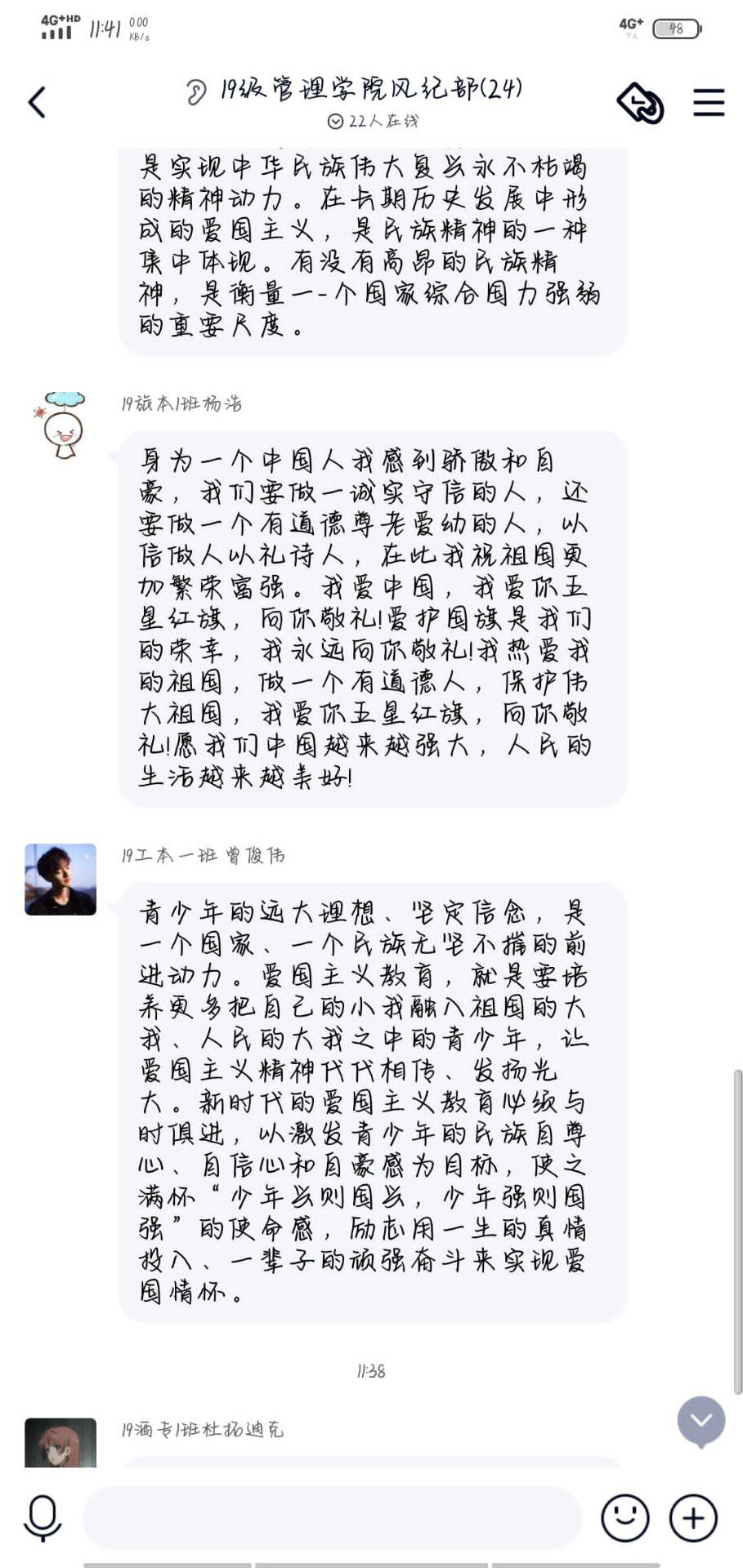 yL23411永利集团官网18级工本2班的王全文在讨论中说到“身为一个中国人,我感到骄傲和自豪,我们要做一个诚实守信的人,还要做一个有道德尊老爱幼的人,以信做人,以礼待人,在此我祝祖国更加繁荣富强,我爱中国,我爱你五星红旗,向你敬礼!爱护国旗,就是我们的荣誉,我永远向你敬礼,我热爱我们的祖国,做一个有道德的人,保护伟大祖国,我爱你五星红旗,向你敬礼!愿我们的中国越来越强大,人民生活越来越好。”在心得感悟中写道“我们是中华民族的儿女,我们深深地爱着这片土地,爱着这个国家,我们爱着动听的国歌,爱着鲜红的国旗,在爱国这件事上,每个人都在用自己的行动热爱着祖国,我们有人32年如一日的守岛升起,有人在雪域边疆守望国土,有人磨练技术,坚守防空前线,有人把革命精神交给下一代,有人把饭碗端在中国人自己手中,有人备战奥运分秒必争,还有人让孩子爱上传统文化,爱国就是我们最深的情,我们都在自己的岗位上,热爱着我们的祖国与祖国同心共行。”