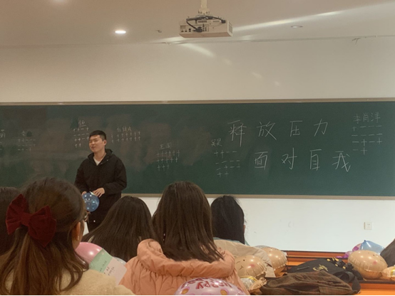 团体活动开始前,心联部向前来参与活动的各位同学介绍了此次团体辅导活动的环节和目的。本次团体辅导活动通过四个环节进行:破冰环节—熟悉组员、认识压力—“压力是什么”、释放压力—扎气球,活动分享—相互鼓励。团体辅导活动现场,同学们积极参与,相互交流,主动分享。