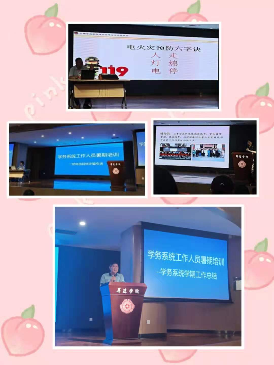 为响应习近平总书记在全国高校思想政治工作会议上的重要讲话精神,提升辅导员业务素质,落实高校立德树人根本任务,公司学务处于7月6日-7月9日在“双创大讲堂”进行了关于电信诈骗、消防安全、辅导员经验交流、学务工作总结等一系列培训活动。