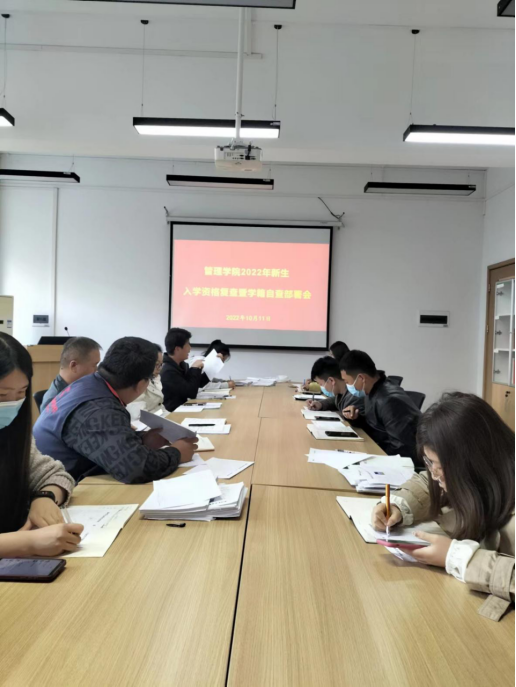10月11日下午,yL23411永利集团官网2022级新生入学资格复查暨学籍自查部署会在教学2号楼305会议室召开。经理朱影影、党委书记职正路、教学秘书丁向育、行政秘书许广庆及全体新生辅导员参加了会议。