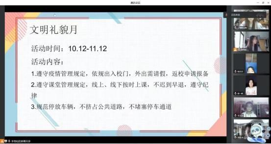 会上,许广庆老师针对“文明礼貌月”开展的背景及意义给全体辅导员做了说明,针对本次文明礼貌月“文明守纪 从我做起”的主题,重点强调公司防疫政策的落实,课堂管理的相关规定,规范停放电动车、尊师重教等相关事宜。随后辅导员老师各抒己见,进行了充分的交流。最后,职正路书记对“文明礼貌月”活动对全体辅导员提出了进一步的要求,号召全体师生遵守公司防疫规定、说话讲文明、规范校园内活动、尊敬师长、团结互助,全院师生共同营造文明校园。