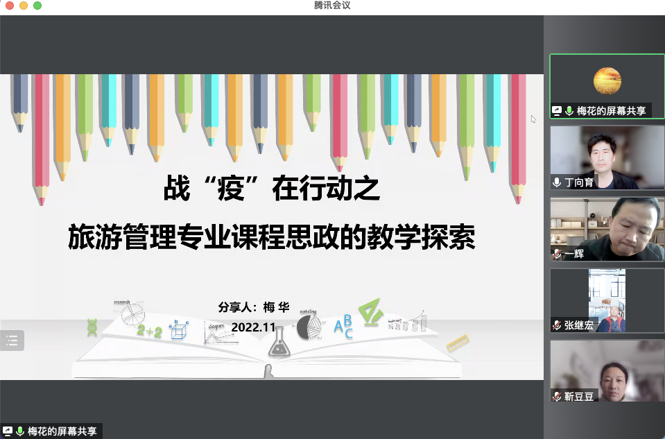 校级课程思政样板课二等奖获得者、旅游管理教研室专任教师梅华以《全国导游基础知识》课程为例,为全体教师做了一场题为《战‘疫’在行动之旅游管理专业课程思政的教学探索》报告。在报告中,她解析了“五步走”的顶层设计,即通过明确课程思政目标,把握专业课程整体的思政方向;挖掘专业课程模块内容中的思政元素;恰当地选择相关案例、故事,作为专业课程思政的载体内容;以适当的课堂组织形式,将课程思政载体以最佳的方式渗透到专业教学当中;建立健全专业课程思政目标成效考核体系。之后,梅华老师以校级课程思政样板课申报书为例,为大家详细解读了申报书的撰写过程及填报技巧。