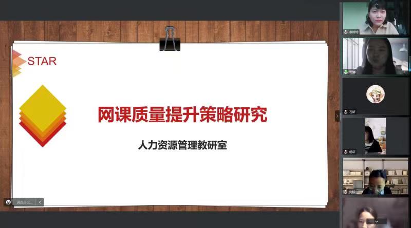 2022年11月17日人力资源管理教研室在腾讯会议组织开展了以“网课质量提升策略”为主题的研讨会。人力资源管理教研室主任靳豆豆主持召开会议,出席研讨会的有教研室全体教职工及员工代表。