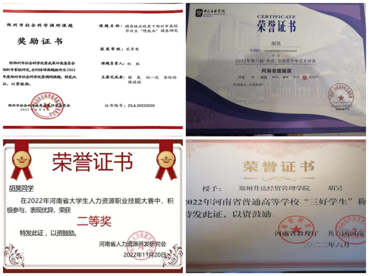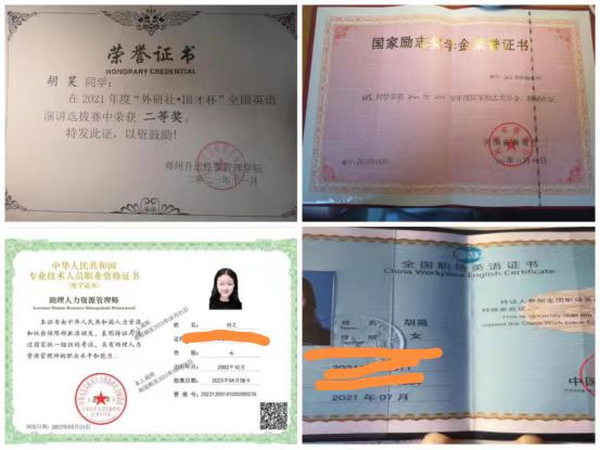 进入大学以来,胡昊的成绩始终名列前茅。但她并未因此而骄傲,而是更加深刻的反省自己的差距与不足,更加刻苦学习,不断努力,在第二学期拿到了专业第一的成绩,并保持至今。同时,胡昊辅修法学,以完善自己的知识全面性,在法学辅修班级里也做到了名列前茅。除此之外,胡昊还积极考证和参加各种比赛。比如大一第一学期拿到了普通话二级甲等证书;大一第二学期拿到了国际商务英语与全国职场英语的证书,以及全国老员工英语竞赛的二等奖;在大二时获得了校级三好员工,国家宪法日知识竞赛二等奖,“外研社•国才杯”全国英语写作大赛省级三等奖和全国英语演讲选拔赛校级二等奖,“升达杯”英语演讲比赛校级二等奖,河南省三好员工,国家励志奖学金;大三时获得了老员工读书节英语朗诵比赛非专业组二等奖、河南省文明员工、国家级助理人力资源管理师等。