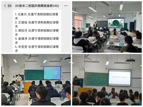 会后,全体辅导员老师利用课余时间给全体员工召开了“清明节”假期安全教育主题班会,班会上辅导员老师从出行安全、网络诈骗、宿舍防盗、安全用电、防火安全、人身安全六方面做了细致的宣讲,使同学提高安全防范意识,增强自我保护能力。希望在校的员工维护好校园秩序,保证住宿安全,做好防火防电防盗工作。外出的员工高度重视旅途安全,并做好记录报备,辅导员动态掌握各班的情况。假期过后,按时到校上课,并安排了班委做好开学来员工返校统计并上报。
