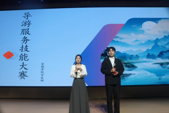 大赛共分形象风采、导游讲解、才艺展示三个环节进行。在比赛开始,舞蹈队为我们带来了优美的舞蹈《铜雀赋》,点燃了现场的氛围。比赛分为上半场和下半场,在上半场刘怡、郝梦燃、张亦婷、苏昕琪等选手通过短视频的形式来介绍自己,风趣又不失庄重;精彩的导游词讲解是导游人员需要具备的基本素质、四位选手们利用多媒体导游方式,分别进行了三峡、清明上河图、云台山、八达岭长城等景点的模拟讲解,他们的语调或激昂,或平仄,或舒缓,无不将观众们带入宏伟壮丽的名山大川以及各式人文景观,领略风景之美,感受历史之重,选手们通过生动活泼、准确清晰的导游语言和大方得体的举止,赢得了现场阵阵掌声;才艺展示环节,绘声绘色的故事、声情并茂的朗诵将现场气氛推向了高潮。