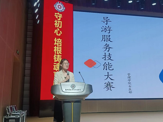 侯谣谣老师对大赛做出总结,她提到参赛选手精神面貌饱满,衣着得体,讲解词不仅结构合理,而且文化内涵丰富,展现了选手们扎实的专业基础技能。提到了一些需要共勉的小问题,即参赛选手的导游词创作能力,表达情感的感染力和自身扎实的文化素养。