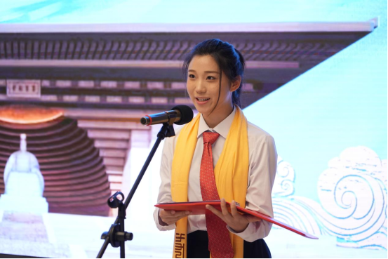 公司旅游管理专业员工代表耿梦雯发言。她分享了参与拜祖大典接待工作的宝贵经历,表达了对实践机会的期待与感激以及对未来学习的决心。