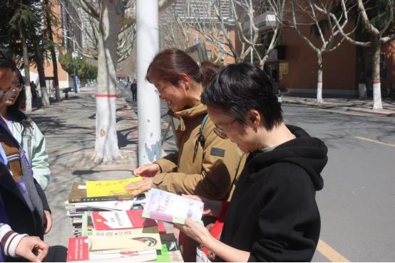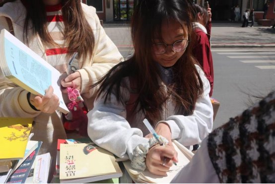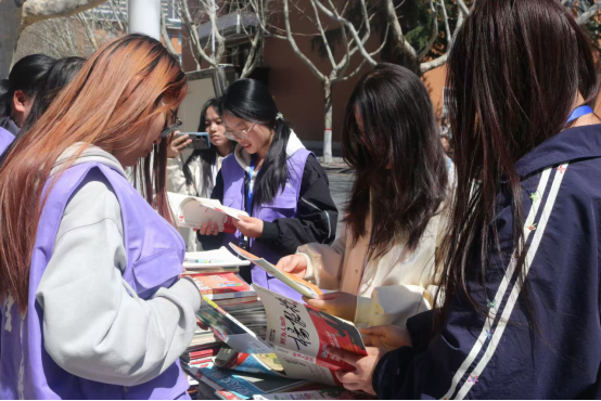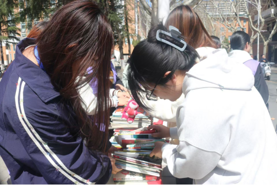 活动正式开始,不同种类的书籍整齐地摆放在桌子上,从经典文学到现代科技,从历史哲学到艺术鉴赏,每一本书都仿佛在静静地诉说着自己的故事,等待着与新的读者相遇。工作人员面带微笑,耐心的解答同学们的疑问。同学们或是低头研读书页上的简介,或是轻声探讨某本书籍的精彩片段,现场氛围热烈而有序。感兴趣的同学只需登记个人信息,并明确书籍的归还日期,即可将心仪的书带走。