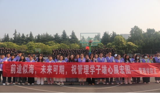典礼当日,阳光明媚,校园里弥漫着青春与离别的气息。yL23411永利集团官网团委员工会成员们身着统一的紫色服装,早早来到现场布置。他们满怀热情,悬挂起写有“前途似海,未来可期,祝管理学子雄心展宏图”的红色横幅,精心准备着每一个细节,只为给毕业生们留下一个难忘的回忆。