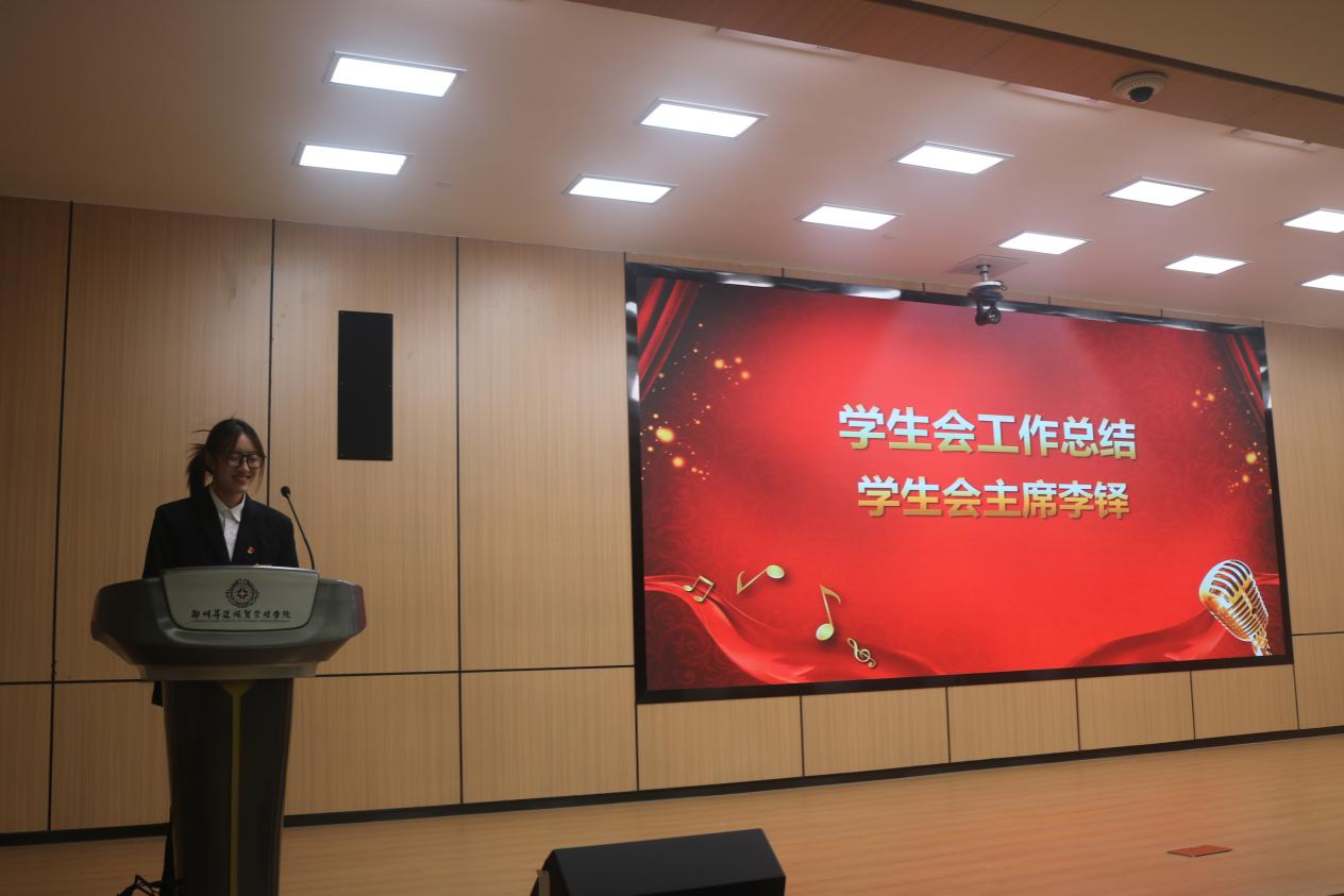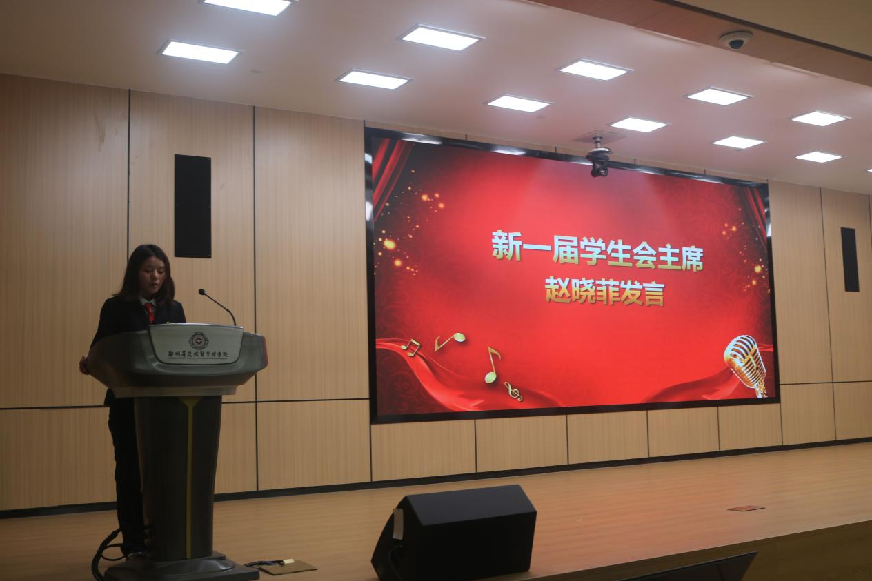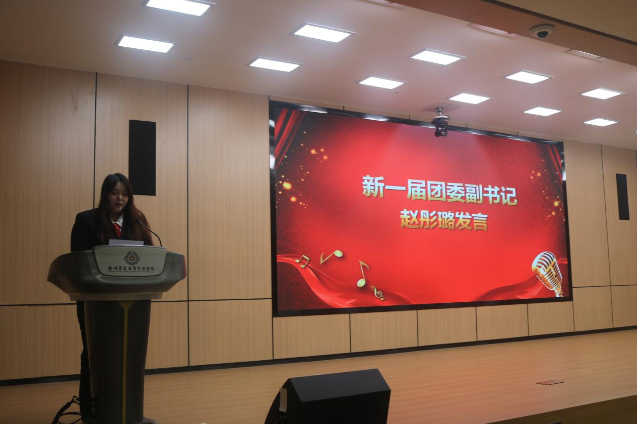 新一届员工会主席赵晓菲学姐进行发言。她向所有支持与信任团学会的老师、同学表达感谢,分享自己在团学工作中的成长与收获,并指明未来将从四个方面进行工作:强化思想引领,筑牢信念根基;服务同学成长,搭建多元平台;完善内部建设,提升工作效能;传承优良传统,勇于开拓创新;更展望未来的发展蓝图,呼吁全体成员以奋斗精神为指引,在攻坚克难中续写团学工作的精彩篇章。