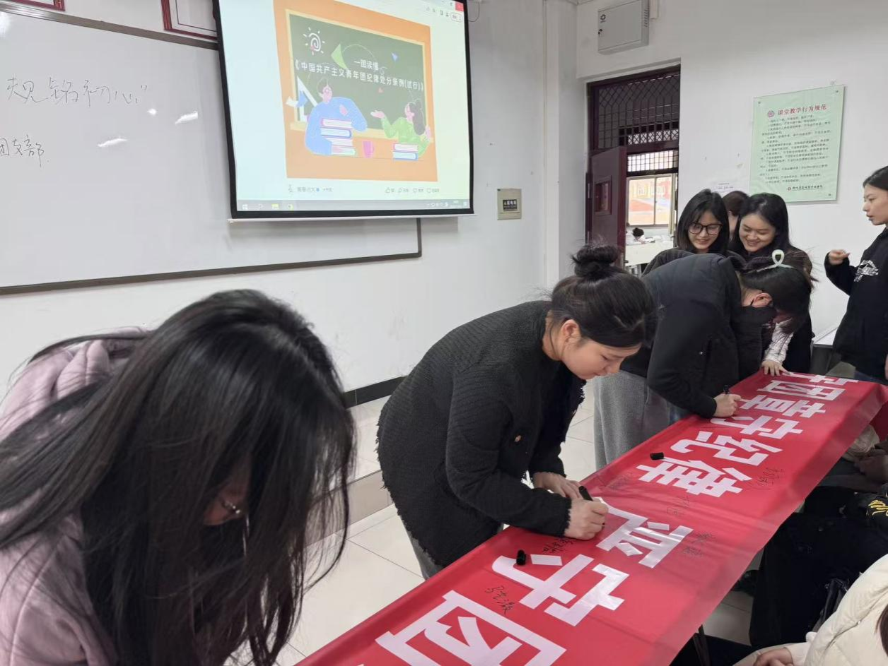 活动中,团支书们通过PPT 系统讲解《中国共产主义青年团章程》《中国共产主义青年团纪律处分条例(试行)》,重点阐释团员在政治、组织、廉洁、群众、工作及生活纪律方面的具体要求。2024 级旅游管理本科 1 班创新采用 “手工 + 红色” 模式,让同学们在制作红色手工、分享设计思路的过程中深化红色文化认同与纪律意识;2025 级工业工程 1 班组织团员代表结合学习生活实际,围绕 “如何在日常中践行团章要求” 等话题展开热烈研讨,在交流中凝聚思想共识。各班级均设置了团规知识快问快答、纪律感悟分享等环节,部分班级还通过签名承诺等仪式化环节,引导团员青年将纪律要求内化于心、外化于行,增强组织归属感与责任担当。