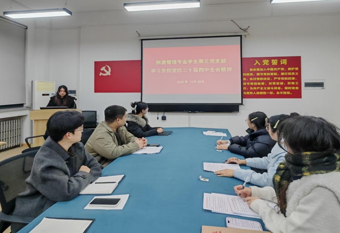 为深入学习贯彻党的二十届四中全会精神,准确把握“十五五”规划的宏伟蓝图,11月27日下午,旅游管理专业员工第三党支部在2号楼305会议室组织学习贯彻党的二十届四中全会精神。此次会议由党支部书记王洁主持,支部全体党员参加会议。